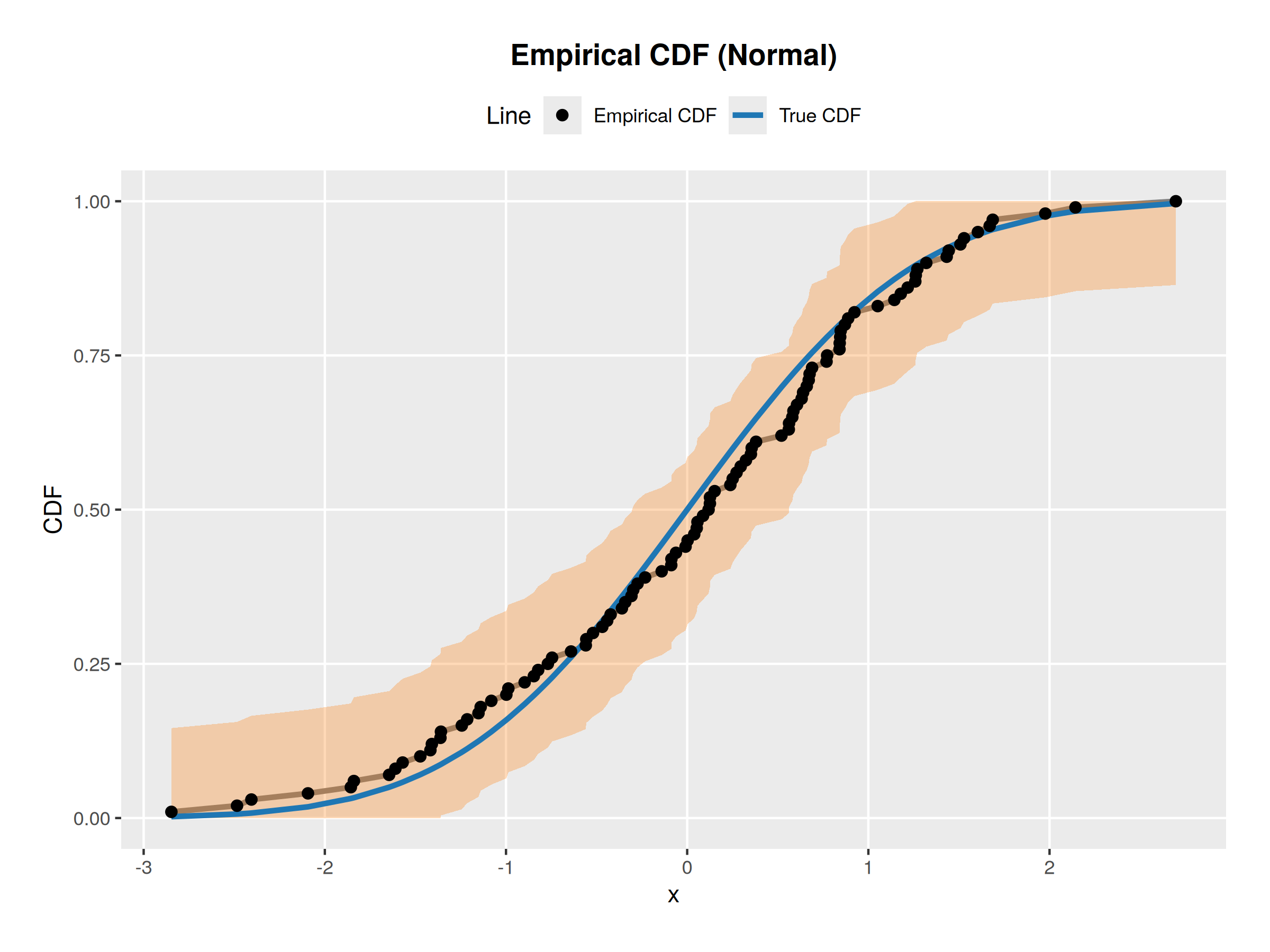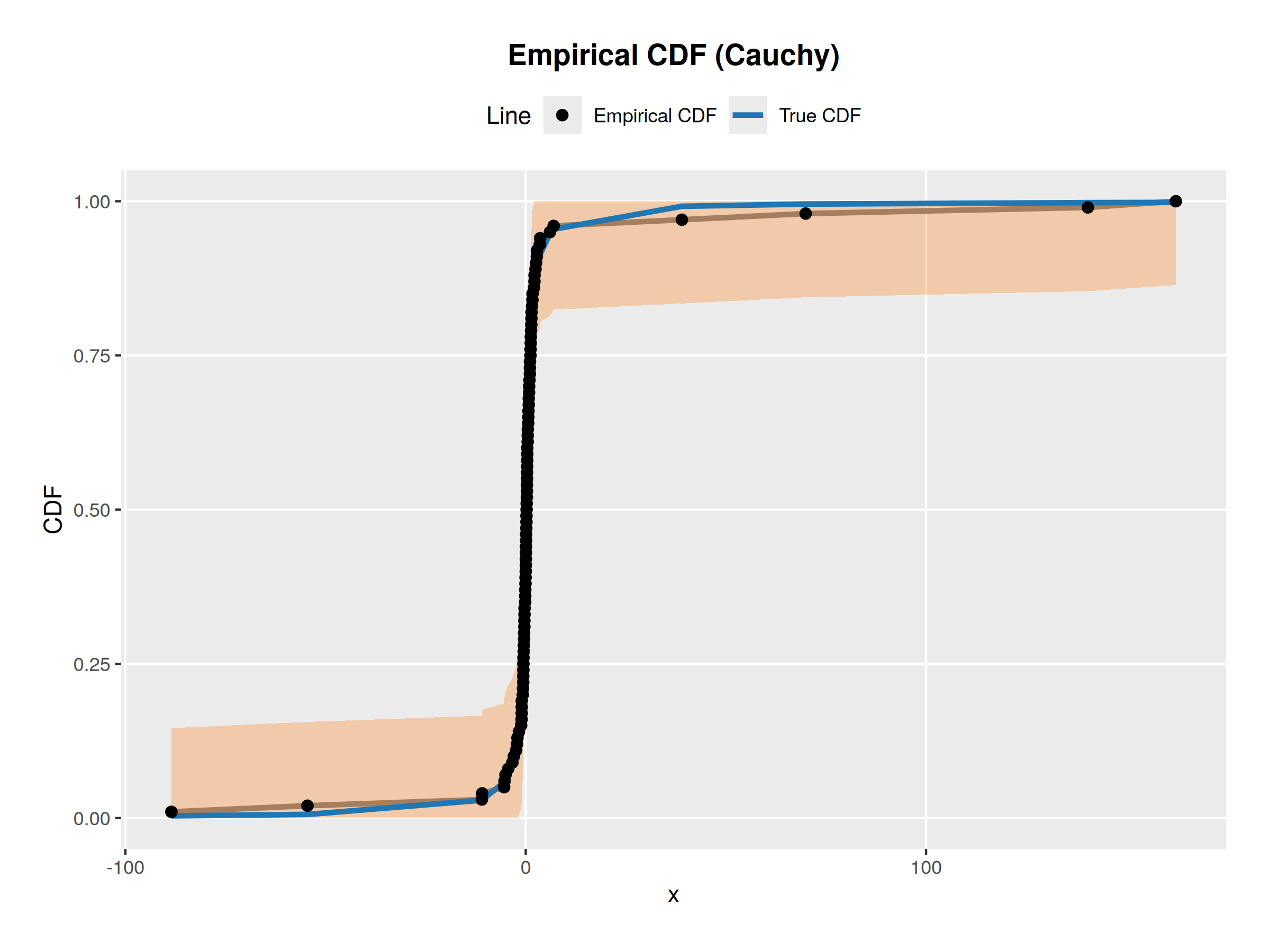 My textbook gave me the exercise of generating 100 observations from a normal \(\mathcal{N}(0, 1)\) distribution then computing the 95% confidence bands for the cdf given these observations then to repeat the experiment for the cauchy distribution.